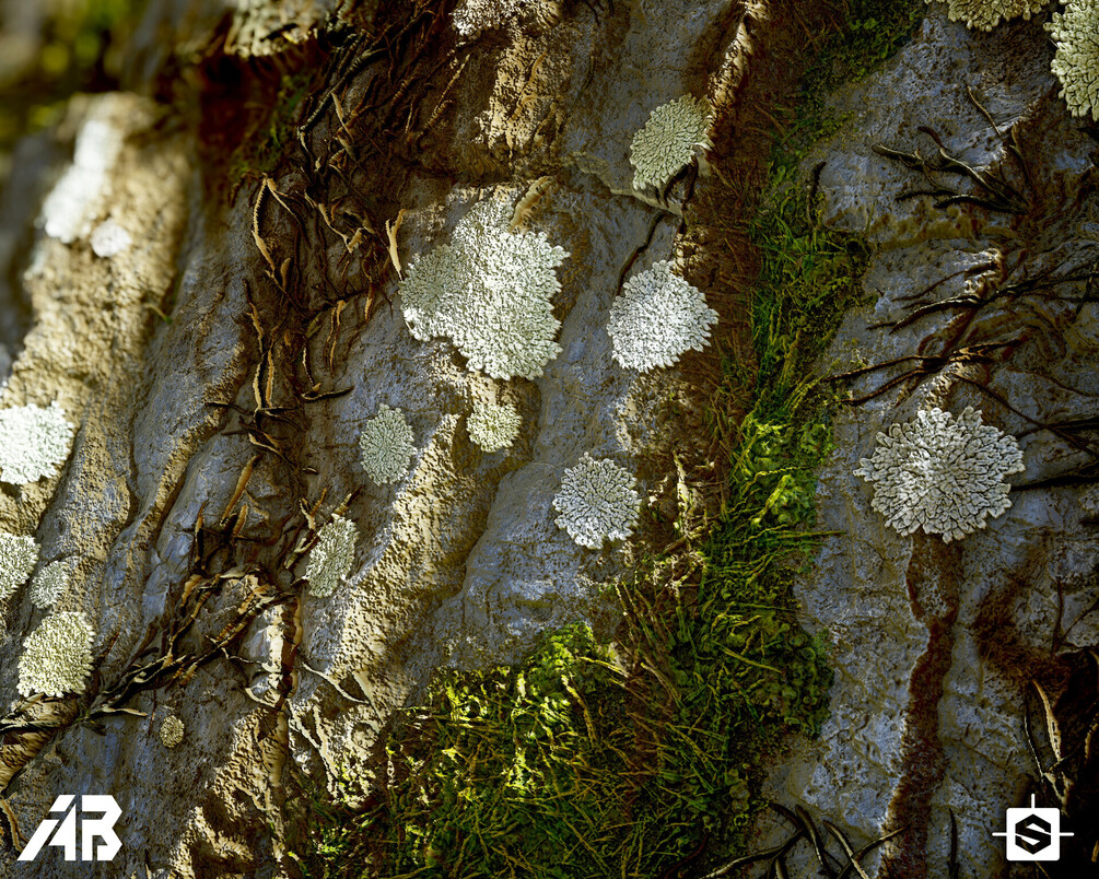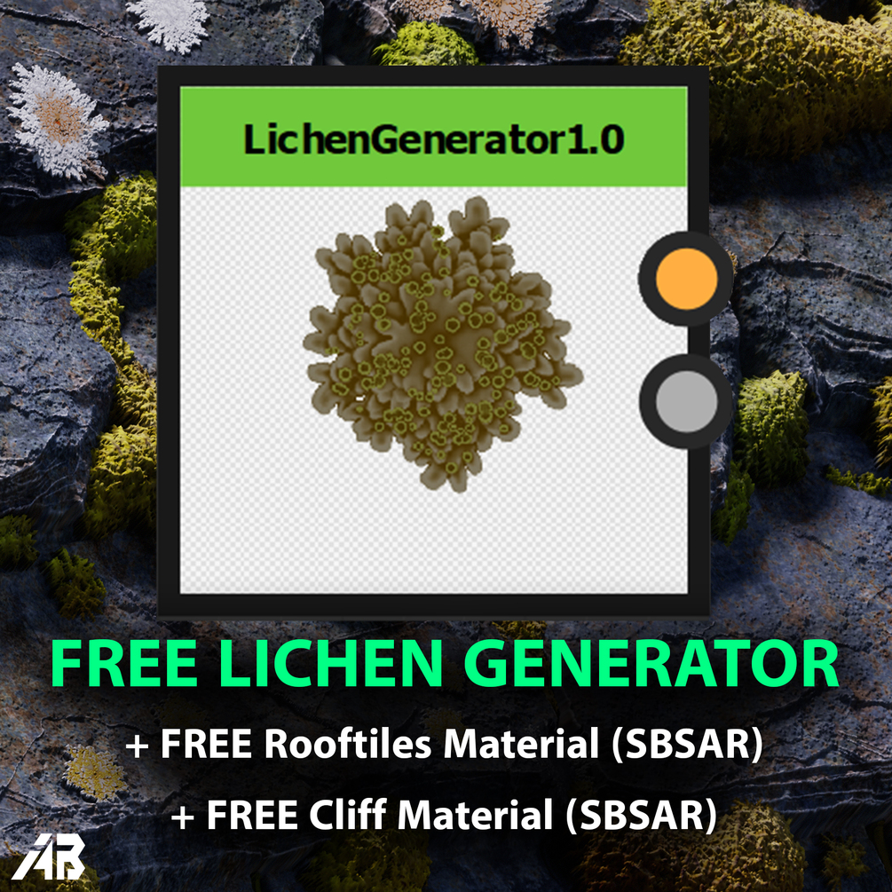 This Lichen Generator with the Lichen Splatter (.SBSAR) give you the ability to create your own infinite realistic variations of lichen covered materials, which allows you to switch between types of lichens as well, you can control many options and parameters that will save you a lot of time, the same goes with the included materials